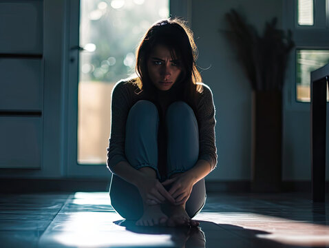 Woman Sitting on Floor in Dark Room, Solitude, Contemplation, Loneliness, Reflection, Serenity, Absence, Isolation, Silence, Stillness, Meditation
