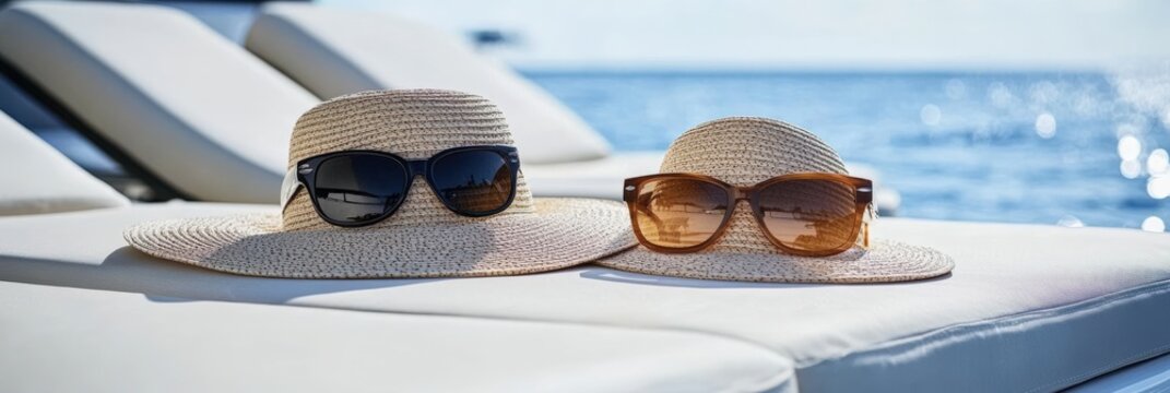 Two Stylish Sun Hats and Sunglasses Relaxing by the Poolside in a Luxurious Setting during a Bright Summer Day