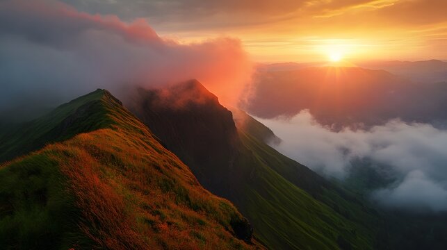 A stunning sunset over a mountain range with clouds forming a blanket over the valleys.