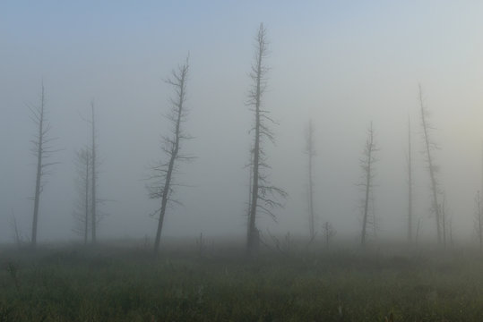 dead trees in the fog on the marsh in Yamal
