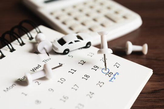 For payment plan, schedule, buy or sell property planning concept. Close up of embroidered white pins on calendar on the 26th with hand writing payday ,blurred calculator and miniature car
