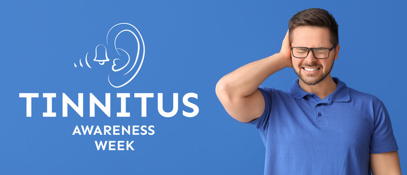 Banner for Tinnitus Awareness Week with young man having hearing disorder