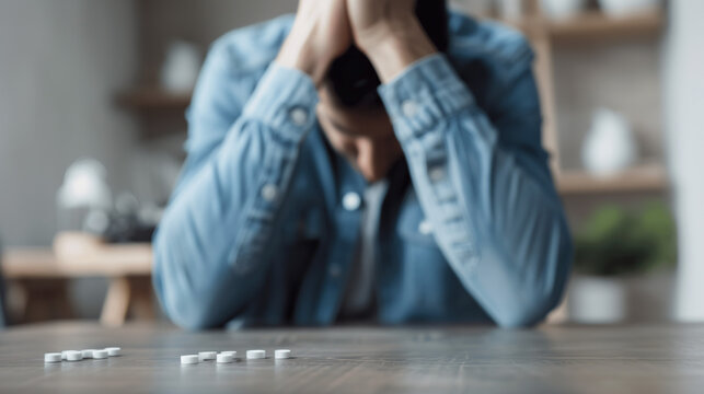 Despairing man with tablets or pills on a table in front of him. Concept for opiate addiction, suicide prevention or other mental or physical medical health issues.