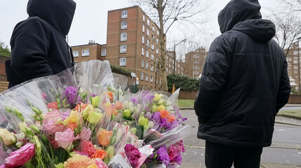People in dark hoodies, stand near an informal shrine comprising flowers left at the scene of a crime in a poor UK urban area, landscape format 16:9 with copy space for text or additions