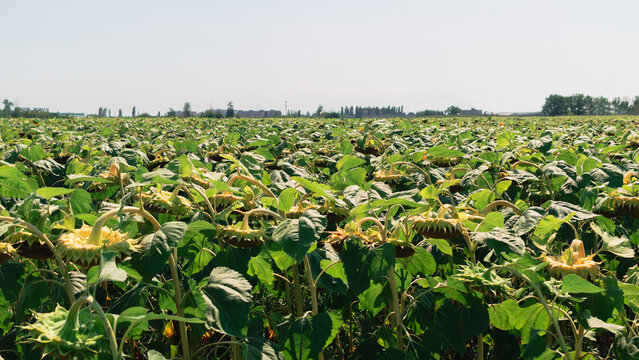 Sunflower field on a bright sunny day. Harvesting. Food crisis concept. Benefits of oilseeds for human nutrition. Nutrition for better skin and hair.