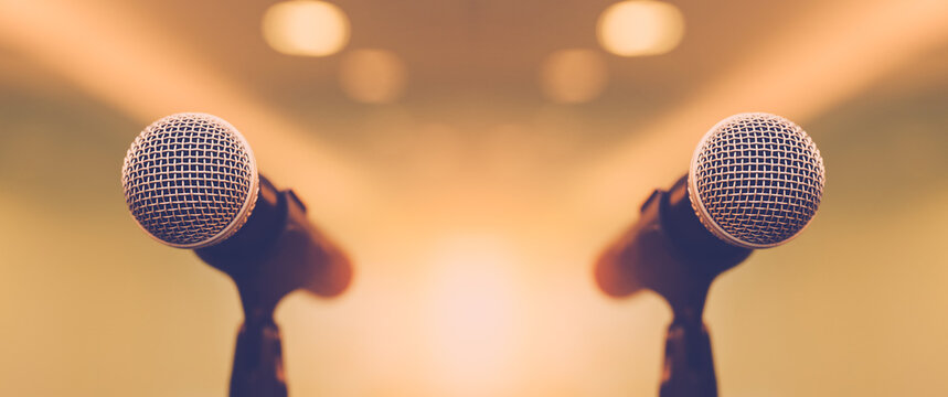 Close-up microphone for press conference speaker reports interview concepts or broadcasting public speaking speech presentation stage performance and reporter news with empty copy space background.
