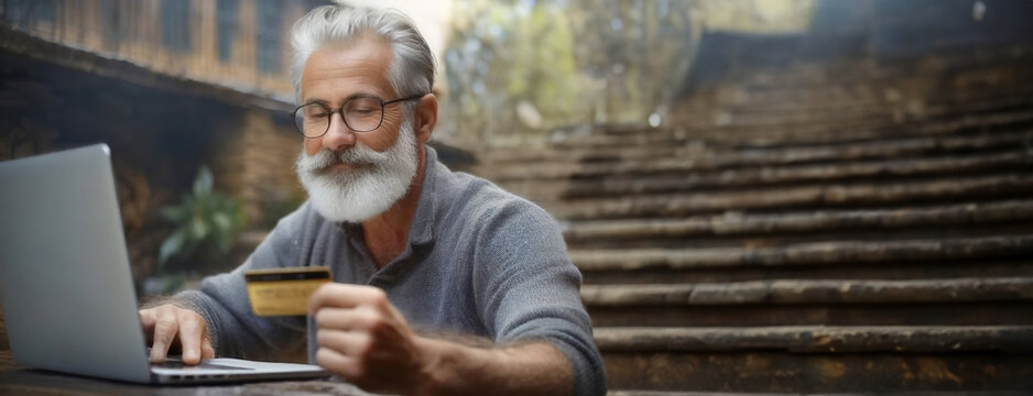 An elderly man with a beard and glasses holding a credit card and using a laptop on stone steps outdoors.