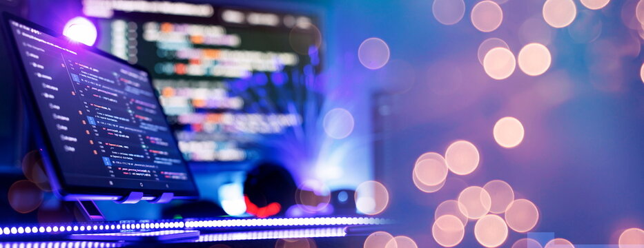 Coding script text on screen. Notebook closeup photo. Running Computer data programming.