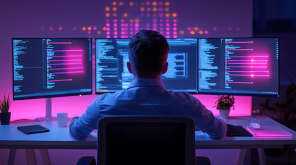 A focused programmer sits at a desk with multiple monitors, coding in a vibrant, illuminated workspace filled with technology.