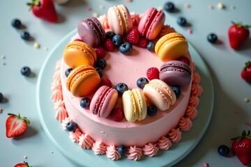 Top view of a decadent birthday cake decorated with macarons and fruits, fresh, cake