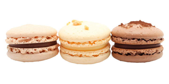 French Macaroons in Three Flavors On Isolated Background. Delicious Pastry.