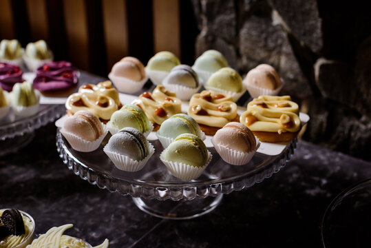 A luxurious arrangement of assorted pastel macarons and small pastries is displayed on a glass cake stand, perfect for a high-end dessert bar or sweet celebration
