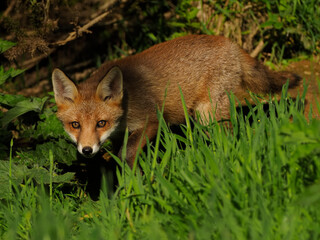 European red fox (Vulpes vulpes) cub walking through grass. UK. June.