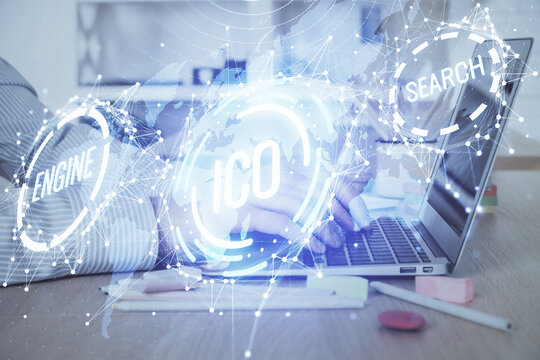 Crypto currency theme hologram with businessman working on computer on background. Concept of blockchain. Multi exposure.