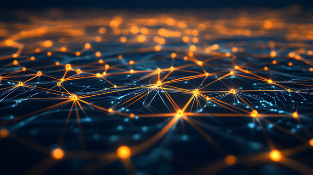 glowing network of interconnected nodes and lines represents futuristic digital data system, illustrating concept of decentralized technology and connectivity