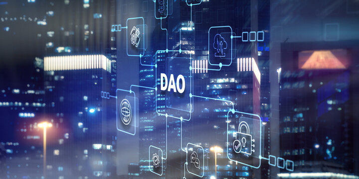 Decentralized Autonomous Organization Concept. Modern City Background
