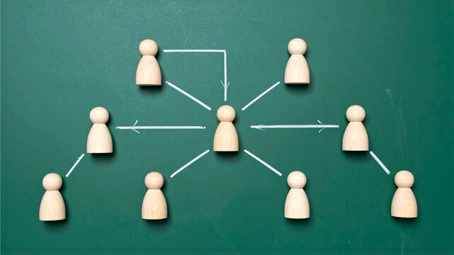 A concept of organization structure with wooden figures and connecting lines, symbolizing networking and relationships. Illustrating hierarchy, communication, and the structure of a group