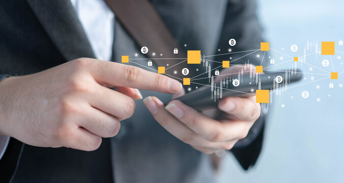 Blockchain Technology and cyber security Concept. A man is using a laptop to access blockchain technology for secure decentralized transactions and immutable digital data management.