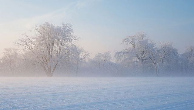 Foggy winter morning with bare trees and pastel sky over frosty field