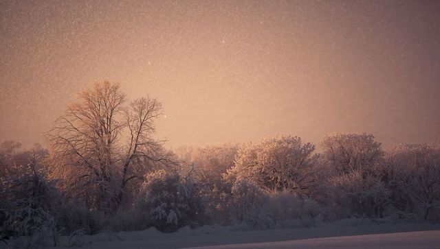 Twilight snowfall over frosted trees and shrubs casting warm dawn glow in winter woodland
