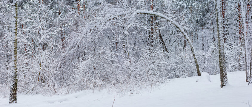 Snow-laden pine branches framing misty winter forest clearing with frosty evergreen border