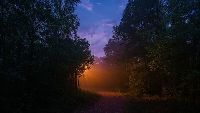 Golden sun rays piercing mist over forest trail at dawn, serene woodland pathway