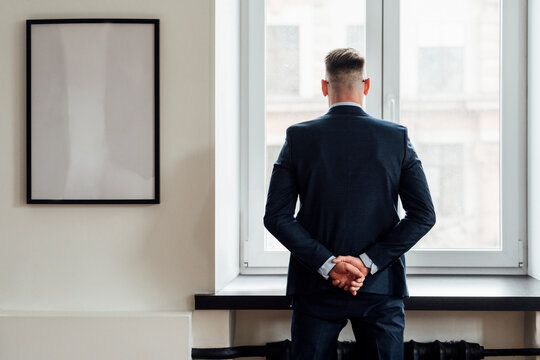 Serious entrepreneur lost thoughts searching problem solution at office window.