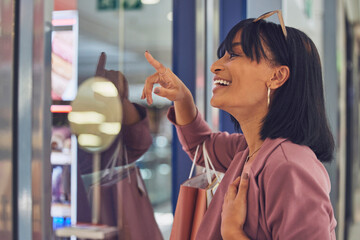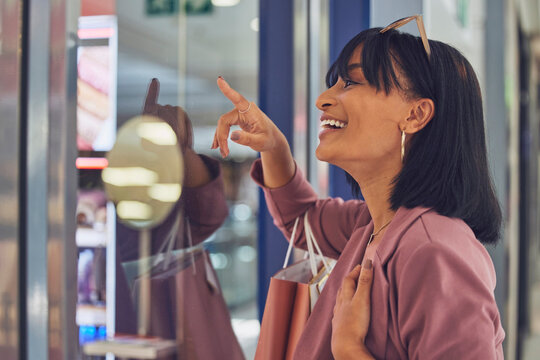Happy woman, window and shopping, mall and excited to buy sales, discount products and luxury fashion clothes. Smile customer pointing in glass, shopping mall and choice, decision and retail boutique