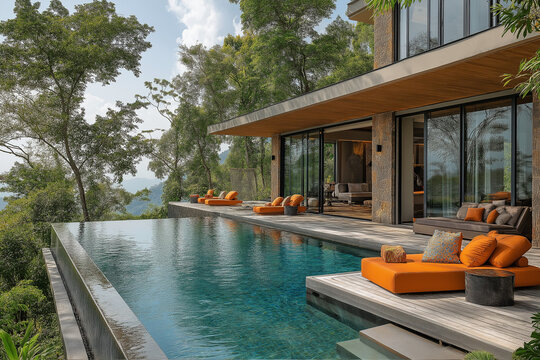 terrasse en bois exotique et salon de jardin près d'une haie de glycines en fleurs