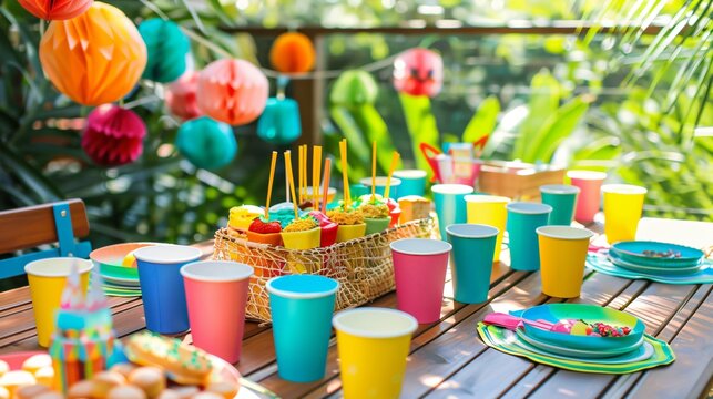 A vibrant party setup with colorful bamboo paper cups, eco-friendly decorations, and a table filled with snacks and bamboo cutlery, all on a wooden deck