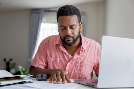Freelancer examining and reading document at desk