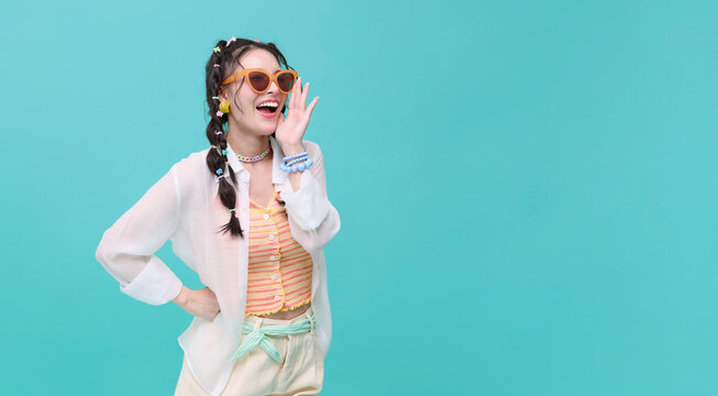 Cheerful young asian teen woman shout story or making announcement representing fun communication summer lifestyle isolated on blue copy space background.