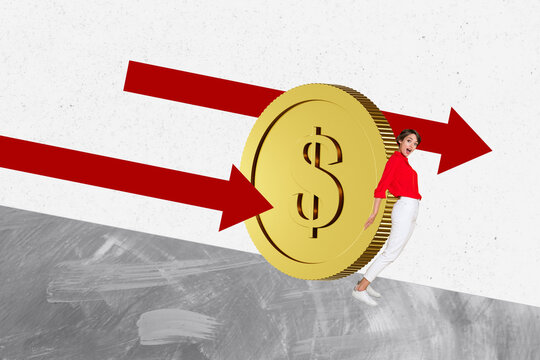 Woman stretching in fitness studio with red arrow and falling performance chart overlay