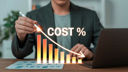 Business professional analyzes cost reduction strategies depicted by a declining bar graph and arrow using a modern digital tablet