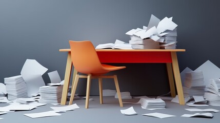 A messy desk with a pile of papers and an orange chair.  The image represents a chaotic work environment.