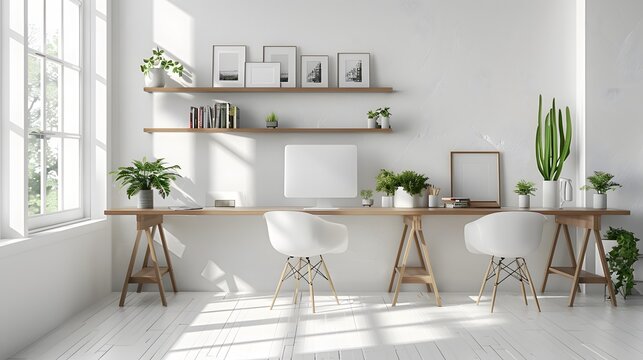 A clean white wall with two desks and chairs, creating an inviting home office space for remote work or study. providing room decoration ideas for spaces.