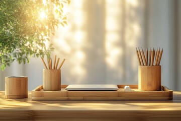 A tranquil, sunlit desk setup featuring bamboo organizers, pencils, a laptop, and a vibrant green plant, creating a peaceful work environment.