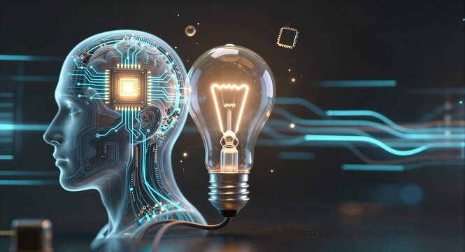 Human brain with circuitry beside glowing lightbulb, symbolizing AI innovation and creativity.
