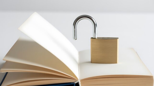 Unlocking Knowledge: An open book, symbol of enlightenment, is paired with a padlock, representing the unveiling of wisdom and secrets within.