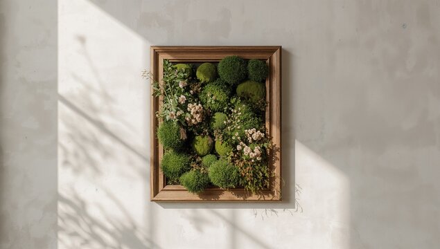 Decorative moss wall art with dried floral accents in a handcrafted wooden frame, designed for home styling