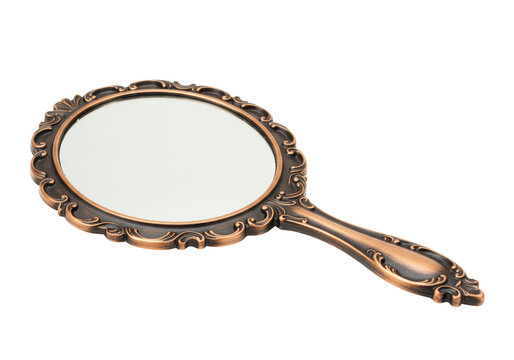 Isolated vintage handheld mirror with decorative bronze frame on seamless backdrop