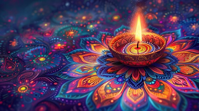 Ancient carved statues in traditional temple with illuminating oil lamps