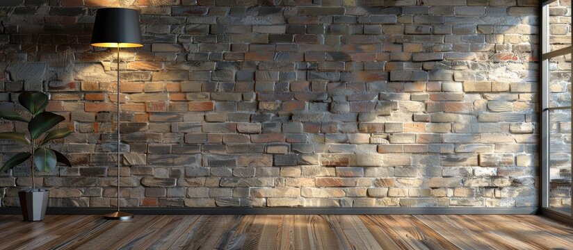 empty living room interior decoration modern lamp and wooden floor, stone wall concept. decorative background for home, office, hotel. Copy space image. Place for adding text and design