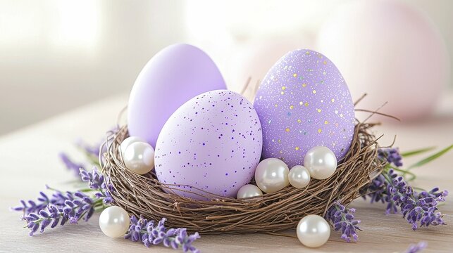 Pastel Purple Easter Eggs In Nest With Lavender And Pearls