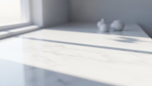 Bright, blurred kitchen counter with decorative objects catching sunlight