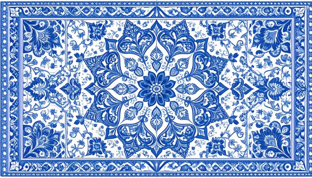 An ornate rectangular design featuring a central floral medallion and detailed floral patterns in shades of blue on a white background