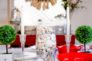 Festively decorated long dinner table at christmas event