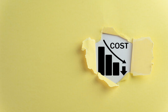 Cost reduction concept. Torn yellow paper reveals a decreasing bar chart and downward arrow with copyspace, symbolizing cost cutting, financial management, and business expense reduction.