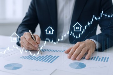 Real Estate Market Analysis: Investor Reviewing Property Value Growth with Charts and Graphs