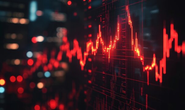 Close-up of a downward arrow graph on a digital screen symbolizing financial loss, with stock charts in the background, representing economic decline and market downturn.